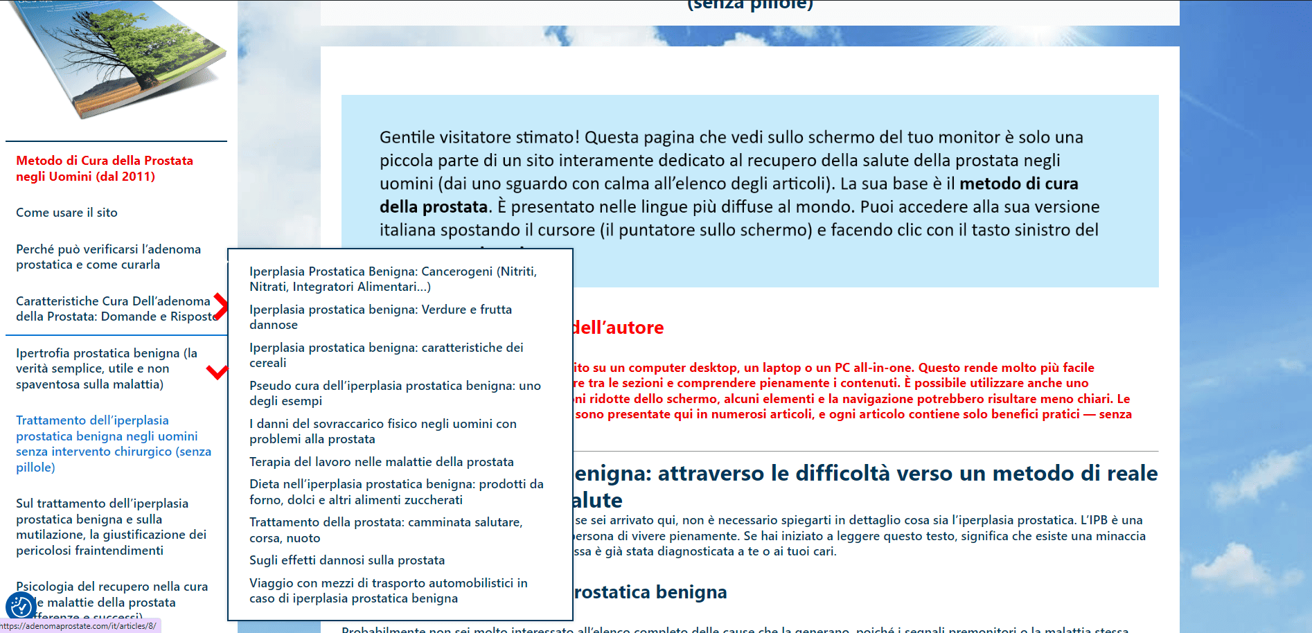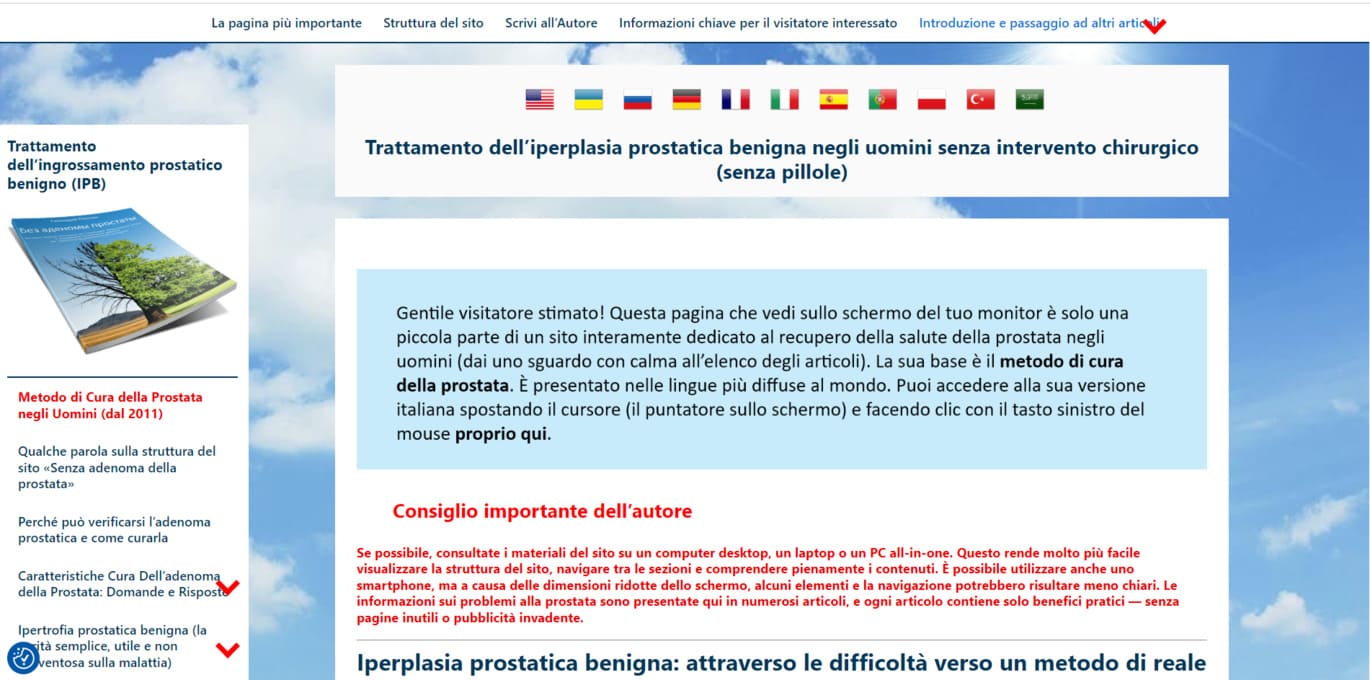 Non esistono standard universali per la progettazione dei siti web e, nell’era attuale, è fondamentale assimilare le informazioni in modo rapido ed efficace, comprendendole correttamente. Questo sito è stato ottimizzato più volte per garantire la massima semplicità, chiarezza e accessibilità fin dalla prima visita. Ogni sezione linguistica contiene quasi cinquanta articoli e un metodo di trattamento dettagliato. Tutte le pubblicazioni sono dedicate a un unico obiettivo: comprendere il problema della prostata negli uomini e offrire soluzioni efficaci per il suo trattamento. Questo articolo è stato scritto dall’autore con lo scopo di aiutare il lettore a orientarsi rapidamente nella struttura del sito, leggere e assimilare ciò che ritiene necessario con il minimo dispendio di tempo.