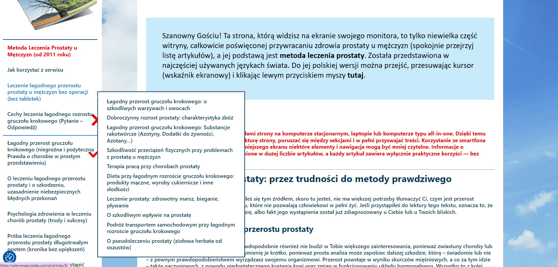 Jeśli to możliwe, zapoznaj się z materiałami strony na komputerze stacjonarnym, laptopie lub komputerze typu all-in-one. Dzięki temu znacznie łatwiej będzie przeglądać strukturę strony, poruszać się między sekcjami i w pełni przyswajać treści. Korzystanie ze smartfona także jest możliwe, jednak z powodu mniejszego ekranu niektóre elementy i nawigacja mogą być mniej czytelne. Informacje o problemach prostaty są tutaj przedstawione w dużej liczbie artykułów, a każdy artykuł zawiera wyłącznie praktyczne korzyści — bez zbędnych stron czy nachalnej reklamy.