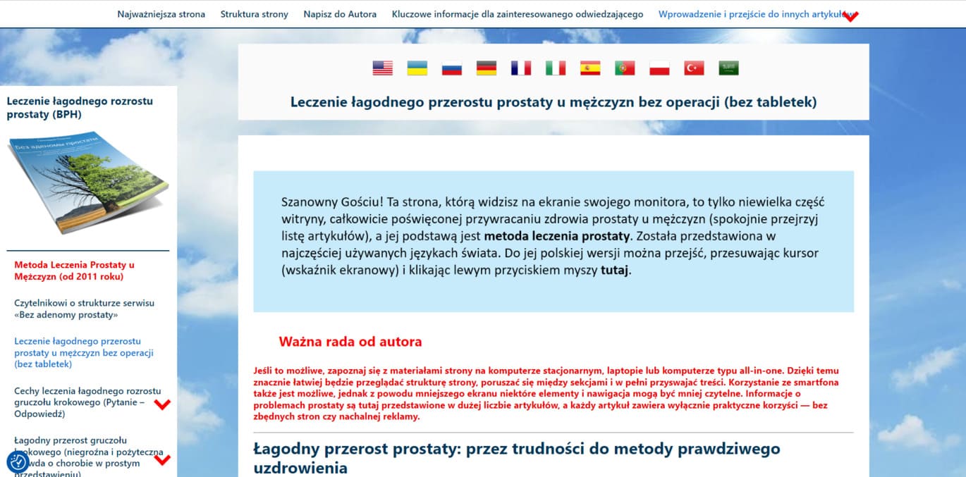 Na świecie nie ma jednolitych standardów w tworzeniu stron internetowych, a współczesne czasy wymagają, aby informacje przyswajać szybko i prawidłowo je rozumieć. Ten serwis był wielokrotnie optymalizowany, aby był jak najbardziej prosty, zrozumiały i dostępny już przy pierwszej wizycie. Strona zawiera niemal pół setki artykułów oraz kompletną metodę leczenia w każdej sekcji językowej. Wszystkie publikacje koncentrują się na jednej tematyce: zrozumieniu problemu i leczeniu prostaty u mężczyzn.